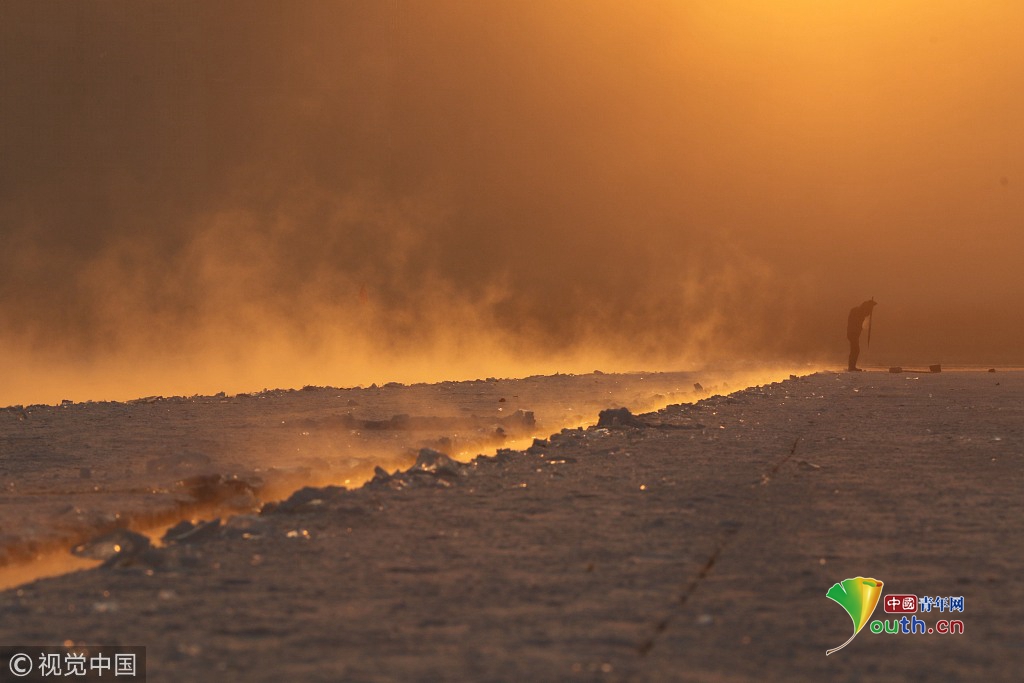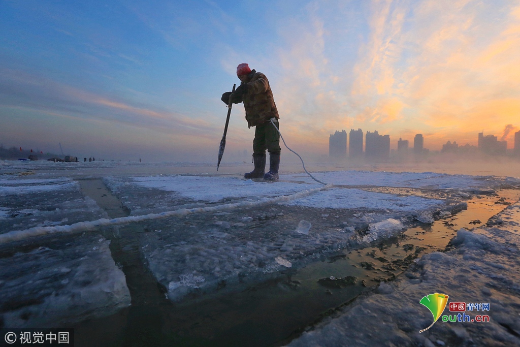 中國(guó)青年網(wǎng)2018年12月13日訊2018年12月11日,黑龍江省哈爾濱市,松花江上,采冰人在漫天霞光中破冰、采冰,金色光芒在水霧上升騰繚繞,給勞動(dòng)的場(chǎng)面增添了詩(shī)意。