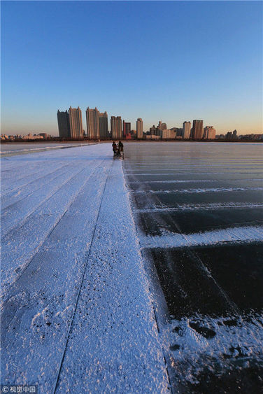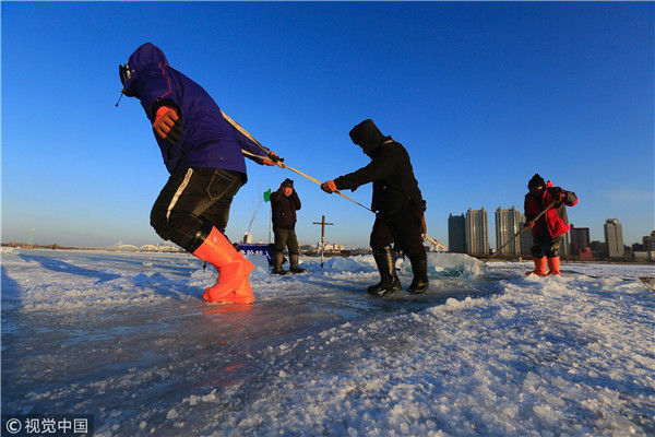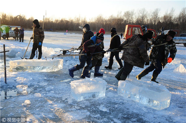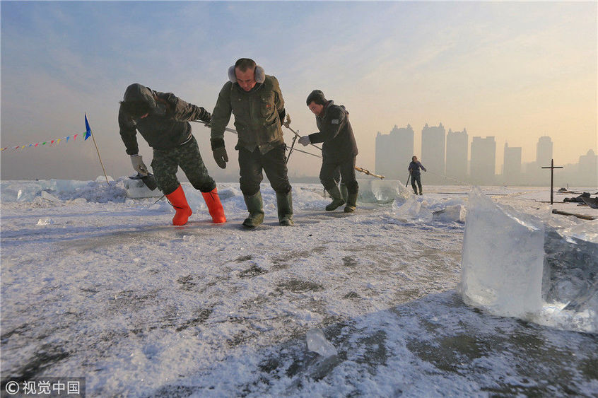 2018年12月8日,最低氣溫零下22度,哈爾濱市江北公路大橋東側(cè)的江面上,工人們正在從江中撈取冰塊,裝車運(yùn)往景區(qū)制作冰燈、冰雕。現(xiàn)場(chǎng),工人先是用電鋸、鐵釬將冰分割成半米多寬,一米多長(zhǎng)的冰塊,接著將其拉出水面。等候在旁的叉車上前,將冰裝上運(yùn)冰的卡車,之后裝滿冰塊的卡車駛往景區(qū)。
