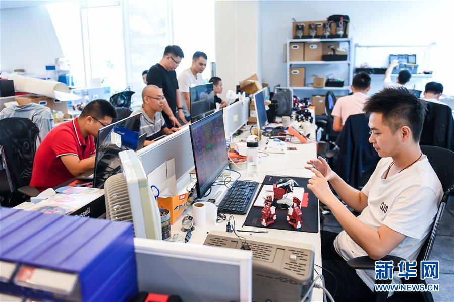 在深圳前海深港青年夢工場,創(chuàng)業(yè)者招俊?。ㄇ坝遥┡c團隊成員在辦公室工作(2018年10月25日攝)。 新華社記者 毛思倩 攝