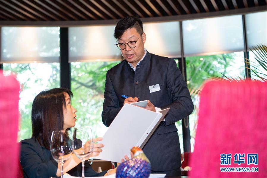 11月26日,澳門旅游學(xué)院教學(xué)餐廳的曾日升在餐廳內(nèi)協(xié)助顧客點(diǎn)菜,他已經(jīng)工作了22年,主要負(fù)責(zé)處理餐廳事項(xiàng)及教導(dǎo)學(xué)生。 新華社記者 張金加 攝