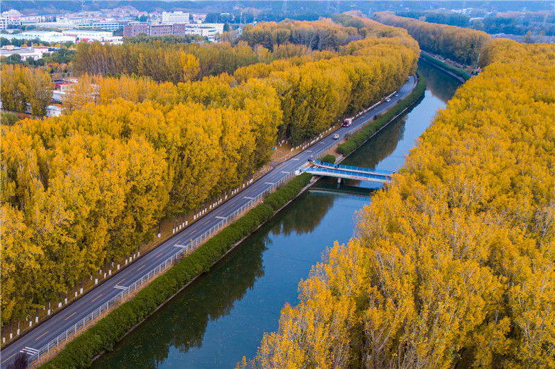 2019年11月03日,北京,京密引水渠昌平段,河道兩旁的楊樹(shù)葉已經(jīng)變黃,碧水黃葉映襯,秋意正濃。