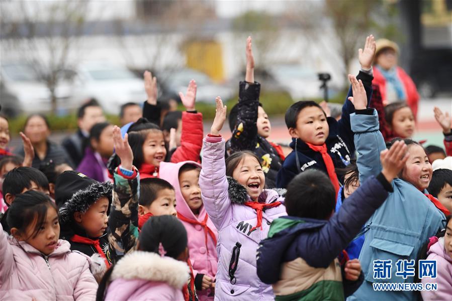 12月12日,中益鄉(xiāng)小學(xué)的同學(xué)們?cè)谖乃囇莩霈F(xiàn)場(chǎng)與演員互動(dòng)。新華社記者 王全超 攝