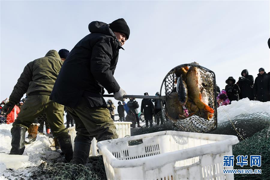 12月18日,一名工作人員將捕撈上來的魚放入筐中。新華社記者劉磊攝
