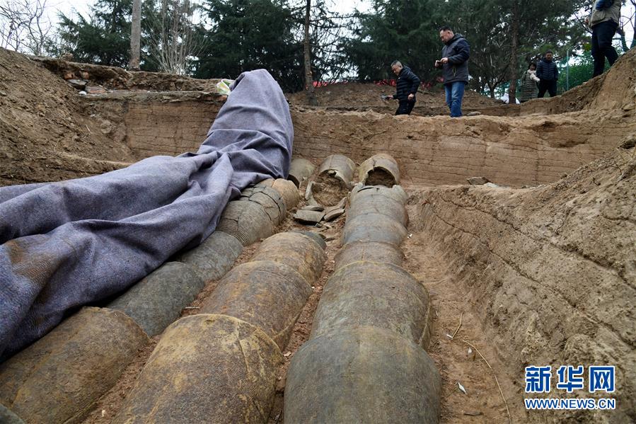 12月21日拍攝的瑯琊臺(tái)遺址考古發(fā)掘現(xiàn)場(chǎng)。三組整齊的陶制管道規(guī)整排列,管道較粗,管壁較厚,陶水管為兩端大小各異的標(biāo)準(zhǔn)件,與現(xiàn)代城市地下排水管件類(lèi)似。新華社記者李紫恒攝