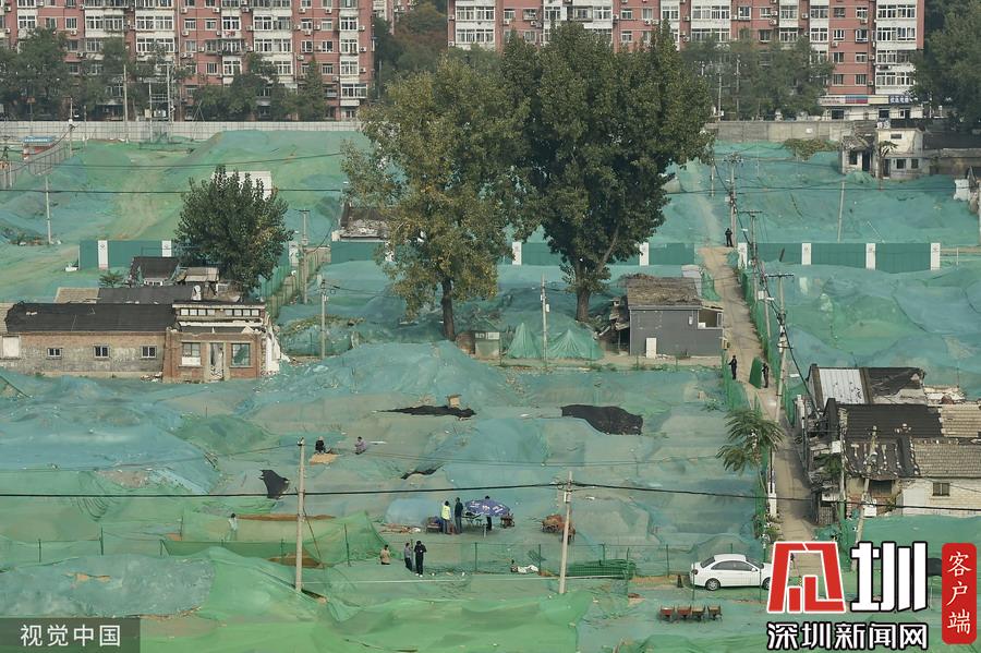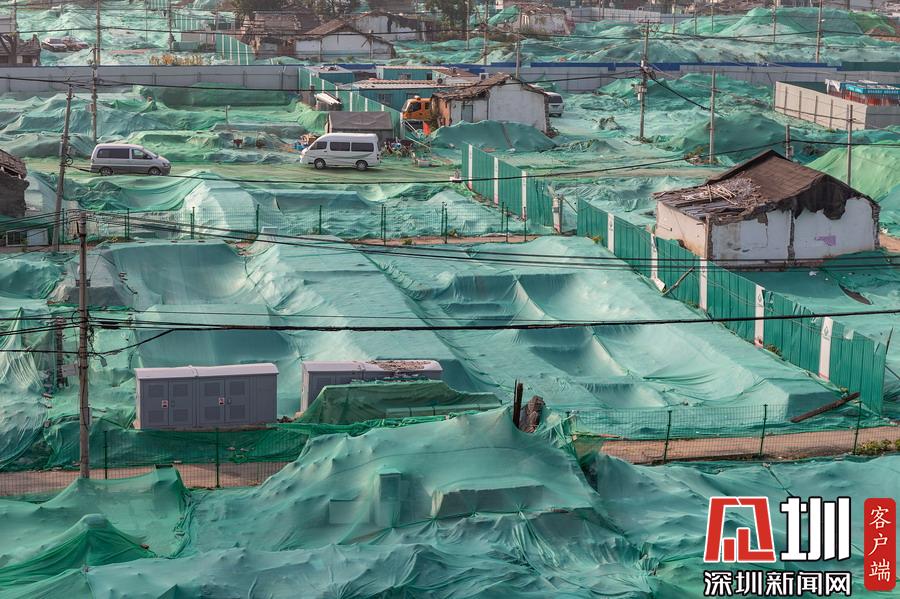 圍擋內(nèi),工地大部分被綠色苫布覆蓋,只露出幾處規(guī)整的探坑。考古工作者正在緊張忙碌中,有些工作人員戴著草帽,坐在馬扎上記錄發(fā)掘細(xì)節(jié),還有一些穿著藍(lán)色背心的工作人員使用工具正在做清理工作。