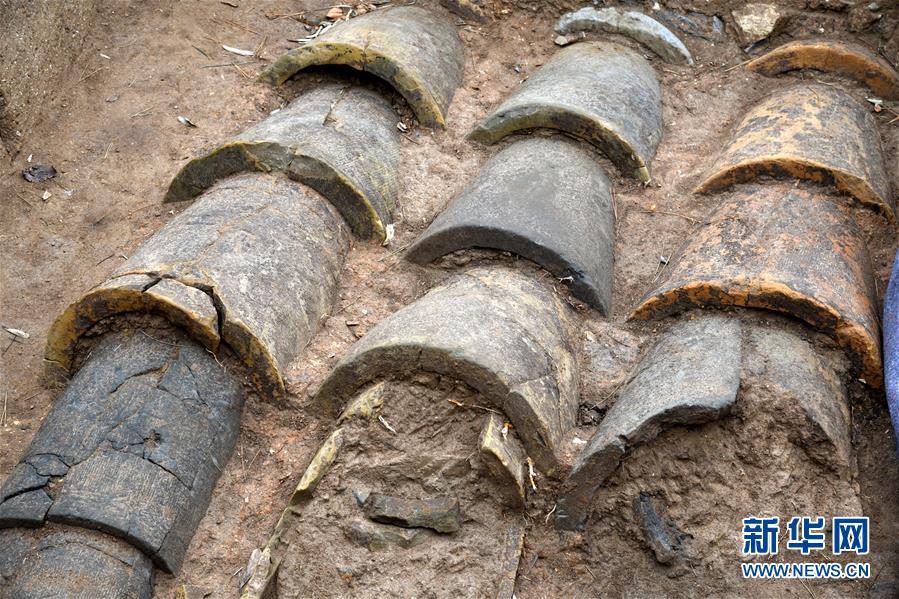 瑯琊臺(tái)遺址考古發(fā)掘現(xiàn)場(chǎng)的陶制管道(12月21日攝)。新華社記者李紫恒攝