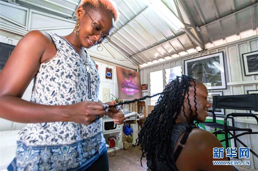 12月20日,在肯尼亞內(nèi)羅畢庫奧納藝術(shù)中心,一名藝術(shù)家為游客編辮子。  新華社記者 王騰 攝