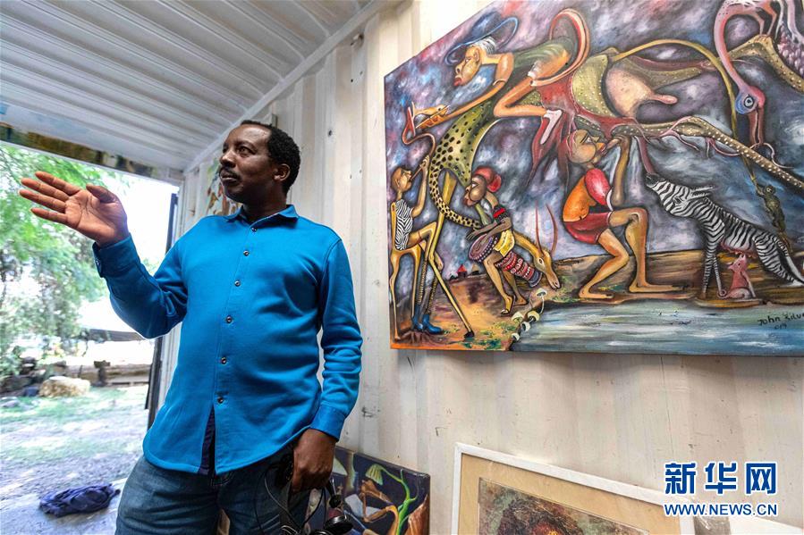 12月20日,在肯尼亞內(nèi)羅畢庫奧納藝術(shù)中心,一名畫家介紹自己的作品。  新華社記者 王騰 攝