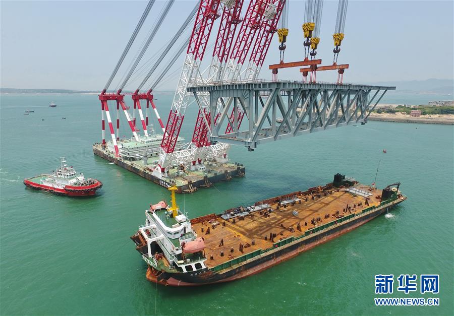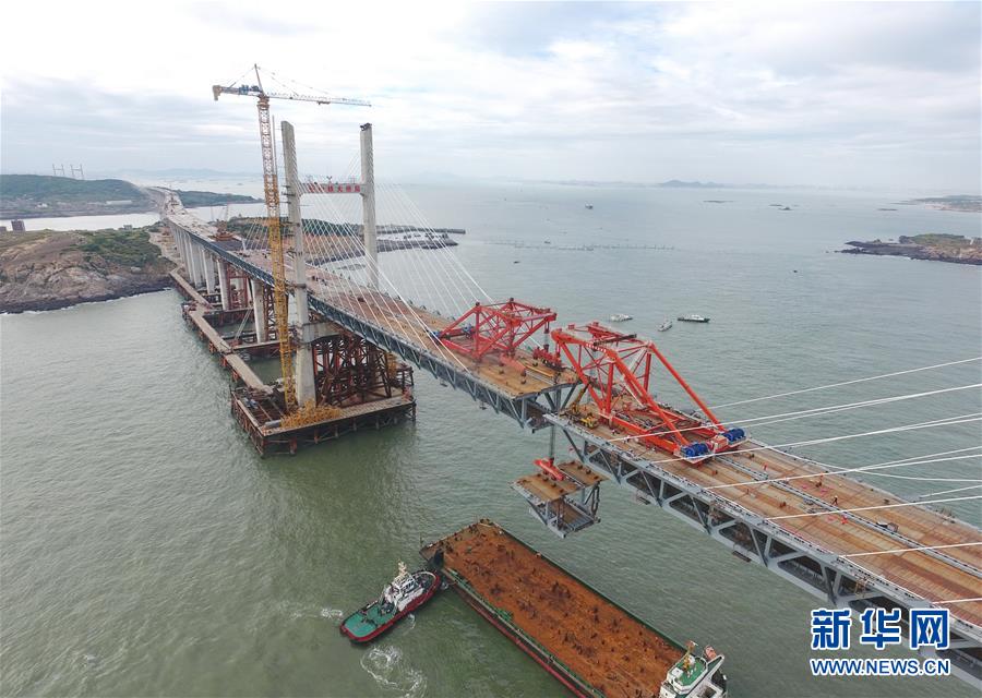 9月21日,平潭海峽公鐵大橋鼓嶼門航道橋的鋼桁梁在吊裝中(無人機(jī)拍攝)。9月25日上午,隨著一段長(zhǎng)17米、重473噸的鋼桁梁被精確固定到位,總長(zhǎng)16.34公里的平潭海峽公鐵大橋合龍貫通。平潭海峽公鐵大橋是福州至平潭鐵路控制性工程,也是“十三五”規(guī)劃中北京至臺(tái)灣高鐵的先期工程。大橋起于福州市長(zhǎng)樂區(qū),“踏”過四座小島后抵達(dá)中國(guó)第五大島平潭,上層設(shè)計(jì)為時(shí)速100公里的六車道高速公路,下層為設(shè)計(jì)時(shí)速200公里的高鐵。據(jù)福建福平鐵路公司介紹,大橋計(jì)劃2020年正式通車。在六年建設(shè)過程中,平潭海峽公鐵大橋所應(yīng)用研發(fā)的多項(xiàng)技術(shù)、裝備創(chuàng)下國(guó)內(nèi)外紀(jì)錄。新華社記者林善傳攝