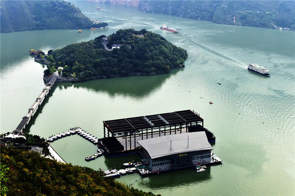 2019年11月3日,位于重慶市奉節(jié)縣長(zhǎng)江三峽入口處、夔門正前方的白帝城再現(xiàn)“孤島景觀”。這座曾經(jīng)雄踞山之峰巒的三國(guó)歷史文化名城隨著三峽工程175米實(shí)驗(yàn)性蓄水完成,僅憑一處風(fēng)雨廊橋可以通過(guò)。圖為2019年11月3日,重慶,四面環(huán)水的“白帝城孤島”風(fēng)貌,各種豪華游輪陸續(xù)駛往寶塔坪旅游碼頭,供游客們登島參觀。饒國(guó)君/視覺(jué)中國(guó)