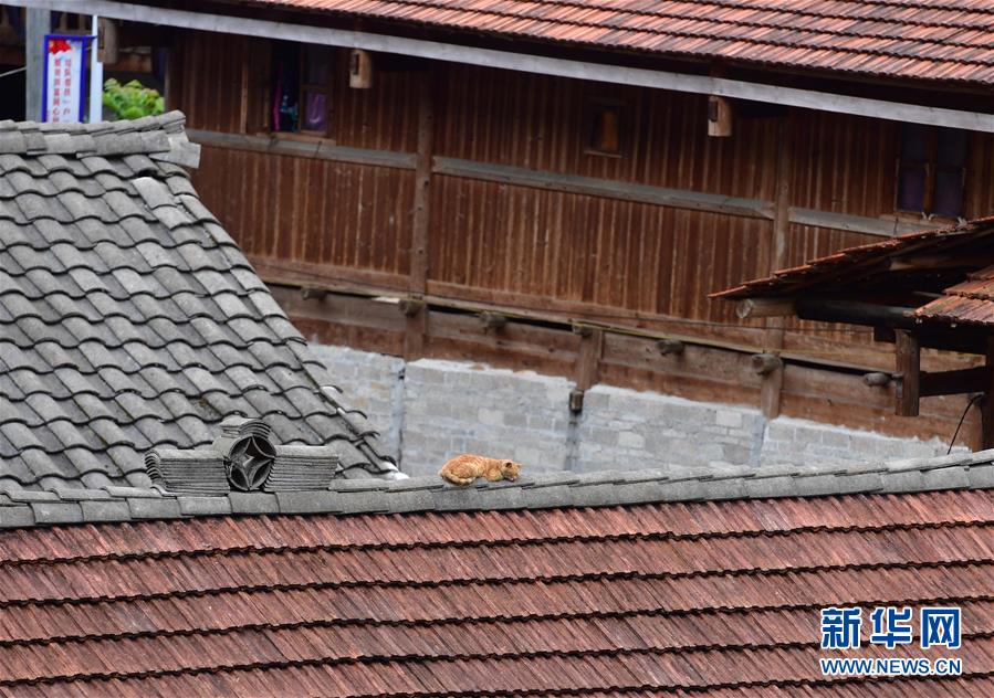 烏英苗寨的一只貓在屋頂睡覺(9月2日攝)。新華社記者黃孝邦攝
