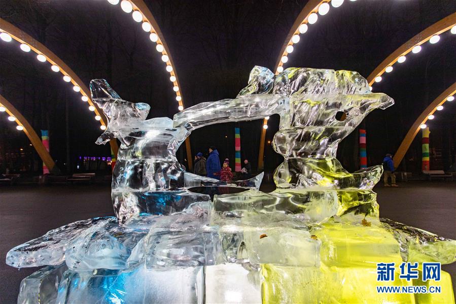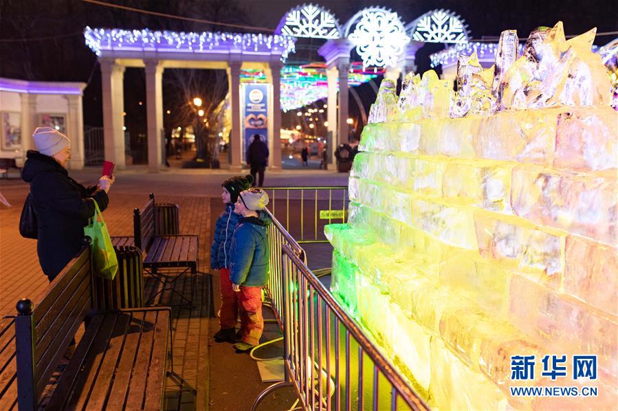 12月24日,在俄羅斯首都莫斯科,人們參觀冰雕藝術(shù)展。 新華社記者 白雪騏 攝