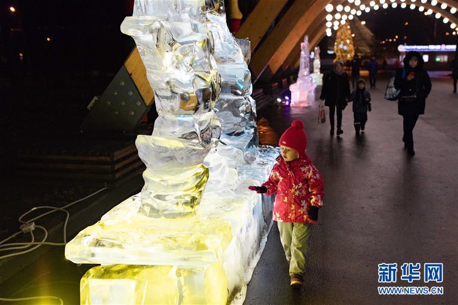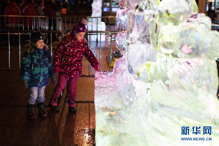 12月24日,在俄羅斯首都莫斯科,小朋友參觀冰雕藝術(shù)展。 哈爾濱冰雕藝術(shù)展24日在莫斯科開幕,現(xiàn)場展出了哈爾濱大劇院、防洪紀念塔以及莫斯科紅場建筑群等惟妙惟肖的冰雕作品,吸引眾多游客駐足拍照。 參加本次冰雕藝術(shù)展的十名冰雕師提前抵達莫斯科,以新中國成立70周年、中俄建交70周年、“一帶一路”倡議等為主題,為莫斯科民眾奉上了精美的新年禮物。 新華社記者 白雪騏 攝