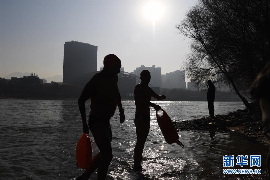 12月19日,在蘭州市馬拉松文化主題公園附近的黃河岸邊,冬泳愛好者入水準備冬泳。新華社記者馬寧攝