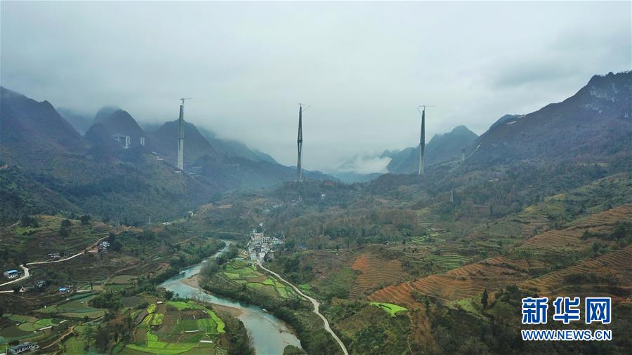 2019年1月7日無人機航拍的平塘特大橋橋塔全景,中為高332米的世界第一高混凝土橋塔。新華社記者歐東衢攝