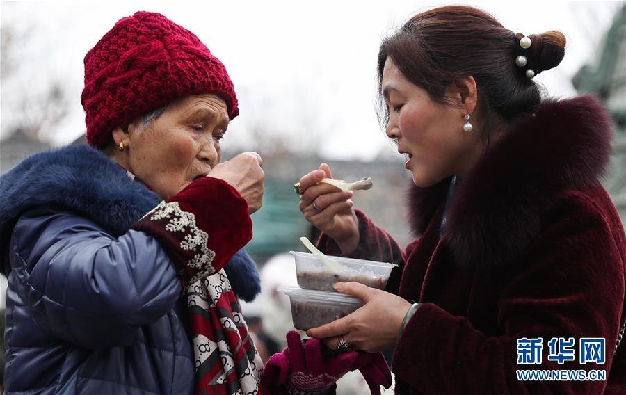 1月2日,兩位市民在閬中古城貢院廣場吃臘八粥。 當日是農歷臘月初八臘八節(jié),四川閬中古城舉行“萬人同品臘八粥”活動,當地居民和眾多游客在貢院廣場免費享用臘八粥。 新華社記者 江宏景 攝