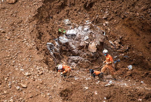 2019年7月26日,救援人員在貴州省水城縣“7·23”特大山體滑坡災害現(xiàn)場進行搜救。新華社記者陶亮攝