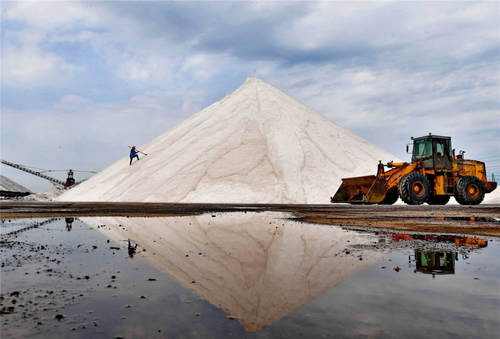 2019年7月3日,河北唐山海港經(jīng)濟(jì)開(kāi)發(fā)區(qū)大清河鹽場(chǎng)的工人在洗鹽場(chǎng)工作。新華社記者楊世堯攝
