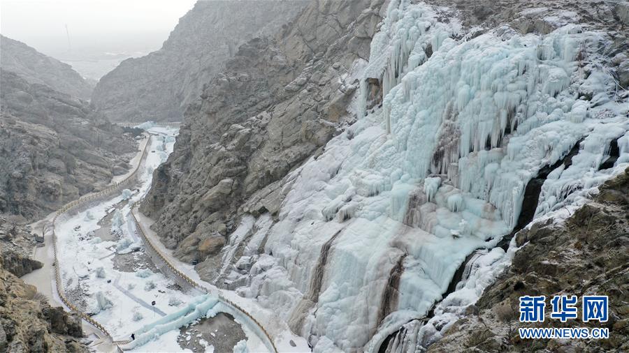 這是1月7日拍攝的賀蘭山巖畫景區(qū)內(nèi)的冰瀑景觀(無人機(jī)照片)。 新華社記者 王鵬 攝