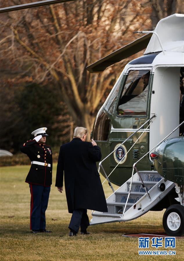 1月9日,在美國華盛頓的白宮南草坪,美國總統(tǒng)特朗普(右)準(zhǔn)備登上直升機(jī),前往俄亥俄州參加競選集會。
