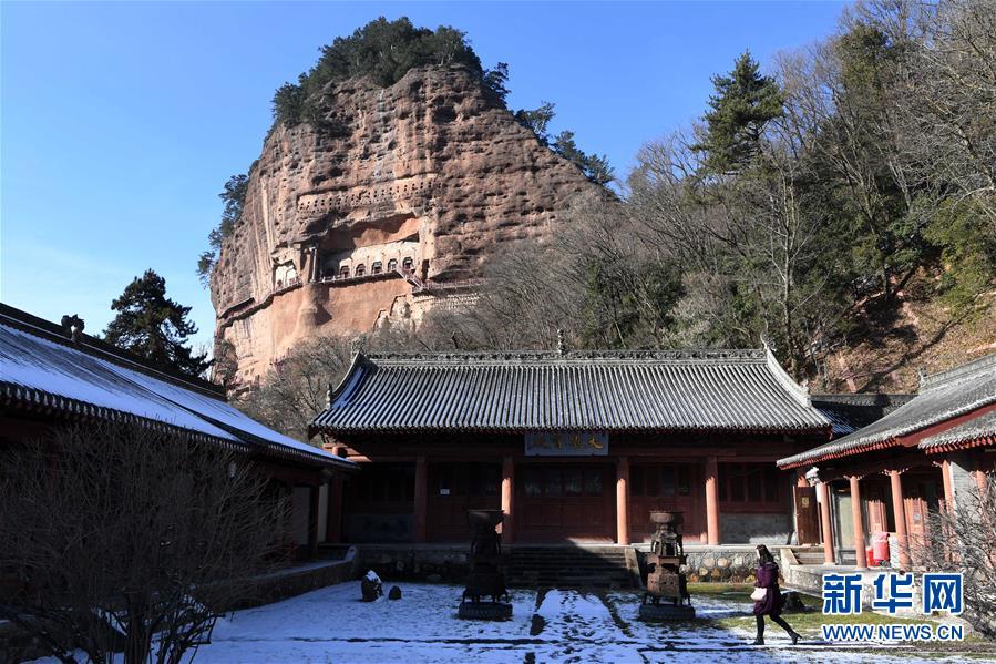 12月26日,游客在麥積山石窟參觀游覽。一場降雪過后,位于甘肅省天水市的麥積山石窟在晴空下尤為壯美。麥積山石窟是中國四大石窟之一,因其山形似麥垛而得名,現存窟龕221座。新華社記者馬寧攝