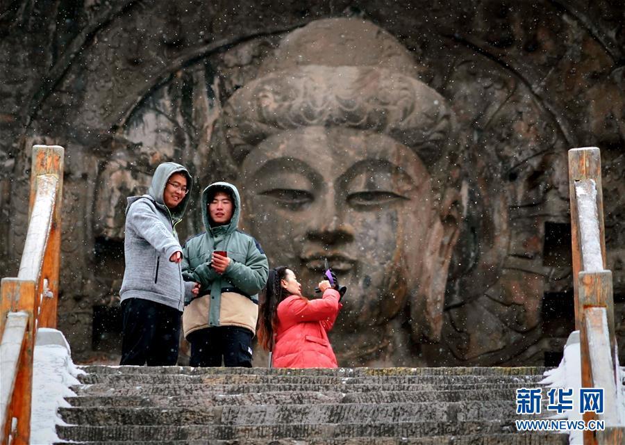 1月9日,游客在洛陽龍門石窟景區(qū)內(nèi)的盧舍那大佛前拍照賞景。新華社記者李安攝