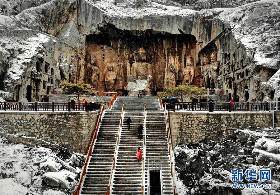 1月9日無(wú)人機(jī)拍攝的洛陽(yáng)龍門(mén)石窟奉先寺。新華社記者李安攝