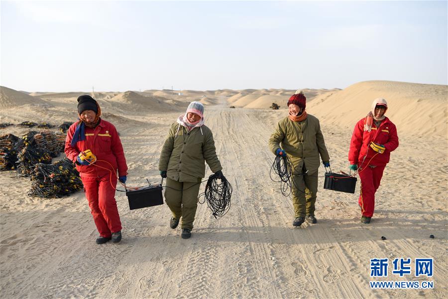 1月14日,4名測線女工抬著電瓶返回營地。地球物理勘探是油氣開發(fā)的第一步,相當(dāng)于給地球做CT。物探工人按照嚴(yán)格的測線部署,在相應(yīng)位置鉆井,然后實施地震,采集地震波數(shù)據(jù)??蒲腥藛T通過數(shù)據(jù)組成的“CT片”,就能夠清晰地“看”到地下的地質(zhì)結(jié)構(gòu),判斷哪里埋藏有石油或者天然氣。2019年10月,東方地球物理勘探有限責(zé)任公司塔里木物探處2113隊進入新疆塔克拉瑪干沙漠腹地,開始中古14-21、塔中2兩個區(qū)塊的三維地震勘探。近2000名物探工人將在1000平方公里的范圍內(nèi)一直工作到2020年4月,這也意味著他們將在塔克拉瑪干沙漠腹地連續(xù)度過第14個除夕夜。蘊藏著豐富石油天然氣資源的新疆塔克拉瑪干沙漠有“死亡之?!敝Q,氣候干燥,年降水量在50毫米以下,冬季地表最低溫度超過零下30攝氏度,是世界油氣勘探難度最大的地區(qū)之一。為避開風(fēng)季,物探工人每年9、10月份進入沙漠,一直工作到來年4月,夜以繼日與黃沙、嚴(yán)寒為伴,用辛勤的汗水,為祖國找油找氣。新華社記者丁磊攝