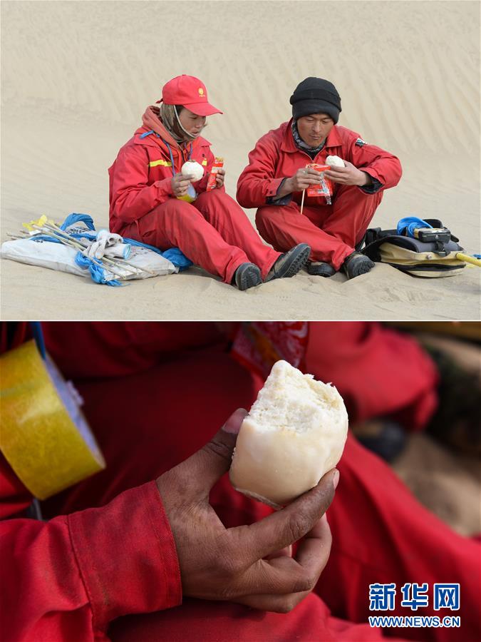 這是一張拼版圖片:上圖為測量工周國燕(左)和丈夫杞朝金在沙漠中解決午餐(1月13日攝);下圖為測量工周國燕在吃冰涼的饅頭(1月13日攝)。地球物理勘探是油氣開發(fā)的第一步,相當于給地球做CT。物探工人按照嚴格的測線部署,在相應位置鉆井,然后實施地震,采集地震波數(shù)據(jù)??蒲腥藛T通過數(shù)據(jù)組成的“CT片”,就能夠清晰地“看”到地下的地質(zhì)結(jié)構(gòu),判斷哪里埋藏有石油或者天然氣。2019年10月,東方地球物理勘探有限責任公司塔里木物探處2113隊進入新疆塔克拉瑪干沙漠腹地,開始中古14-21、塔中2兩個區(qū)塊的三維地震勘探。近2000名物探工人將在1000平方公里的范圍內(nèi)一直工作到2020年4月,這也意味著他們將在塔克拉瑪干沙漠腹地連續(xù)度過第14個除夕夜。蘊藏著豐富石油天然氣資源的新疆塔克拉瑪干沙漠有“死亡之?!敝Q,氣候干燥,年降水量在50毫米以下,冬季地表最低溫度超過零下30攝氏度,是世界油氣勘探難度最大的地區(qū)之一。為避開風季,物探工人每年9、10月份進入沙漠,一直工作到來年4月,夜以繼日與黃沙、嚴寒為伴,用辛勤的汗水,為祖國找油找氣。新華社記者丁磊攝