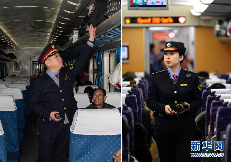 拼版照片左圖:在太原開(kāi)往青島北的K884次列車(chē)上,列車(chē)長(zhǎng)趙耀在檢查旅客的行李擺放,確保安全(新華社記者楊晨光1月11日攝);右圖:在太原南開(kāi)往西安北的D2507次列車(chē)上,列車(chē)長(zhǎng)陳海燕在車(chē)廂里檢查巡查(新華社記者詹彥1月11日攝)。新華社發(fā)