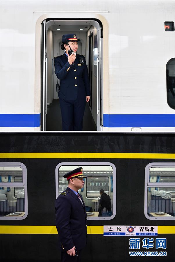 拼版照片上圖:在運城北站,列車長陳海燕確認旅客上車后通過對講機通知司機關(guān)閉車門(新華社記者詹彥1月11日攝);下圖:在太原站,列車長趙耀在列車出發(fā)前檢查巡視(新華社記者楊晨光1月11日攝)。新華社發(fā)
