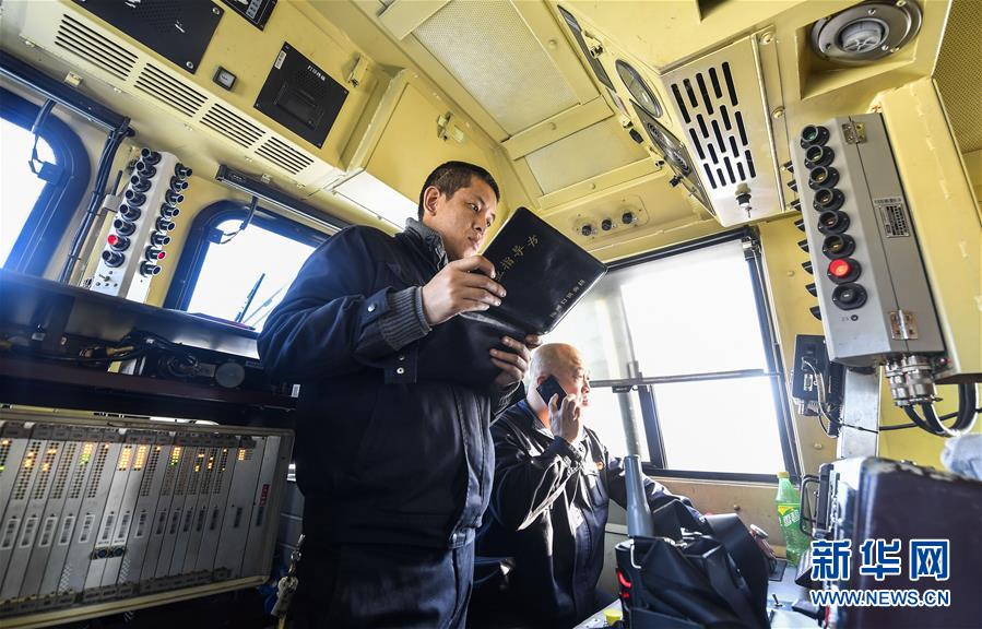 機(jī)車(chē)司機(jī)杜洪峰(右)與副司機(jī)謝振國(guó)進(jìn)行開(kāi)車(chē)前的例行檢查(1月17日攝)。新華社記者 許暢 攝