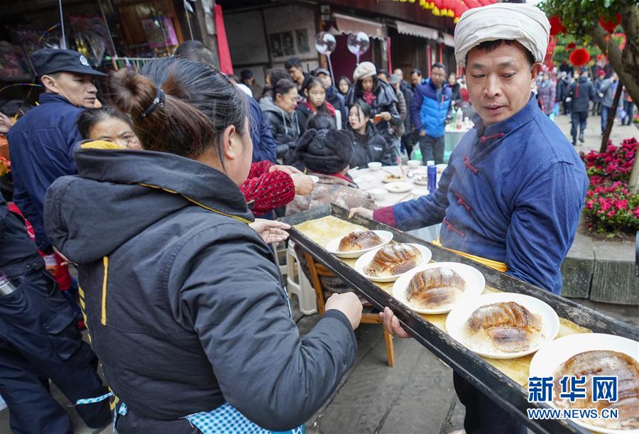 1月18日,在中山古鎮(zhèn)的“千米長宴”上,民間藝人用古鎮(zhèn)傳統(tǒng)“打盆”絕藝給游客們上菜。當日中午,伴隨著一聲“開席嘍”,一年一度的“千米長宴”在重慶市江津區(qū)中山古鎮(zhèn)舉行。噴香的煙熏豆腐、軟糯的夾燒肉、可口的石板糍粑……800余桌年味十足的特色美食,吸引了兩萬多名游客前來體驗傳統(tǒng)民俗,感受“一雙筷子吃遍一條街”的暢快淋漓。中山古鎮(zhèn)自古就有“千米匯長宴萬人祈福祉”的習俗。每年春節(jié)期間,古鎮(zhèn)老街居民都會在千米長街上大擺“百家宴”,祝福生意興隆、家業(yè)興旺、風調(diào)雨順、五谷豐登。新華社記者劉潺攝