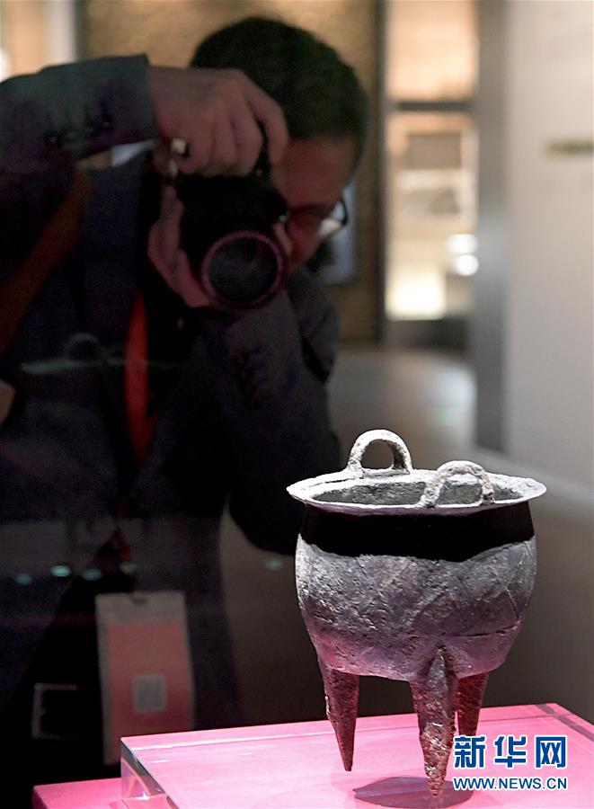 參觀者在二里頭夏都遺址博物館拍攝展品“網(wǎng)格紋銅鼎”(2019年10月19日攝)。新華社記者李安攝