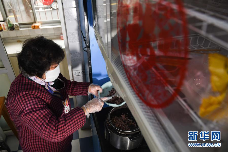 2月28日,張?zhí)m英在合肥市奧林花園社區(qū)的家中做粥,準備送給疫情防控人員。新華社記者張端攝