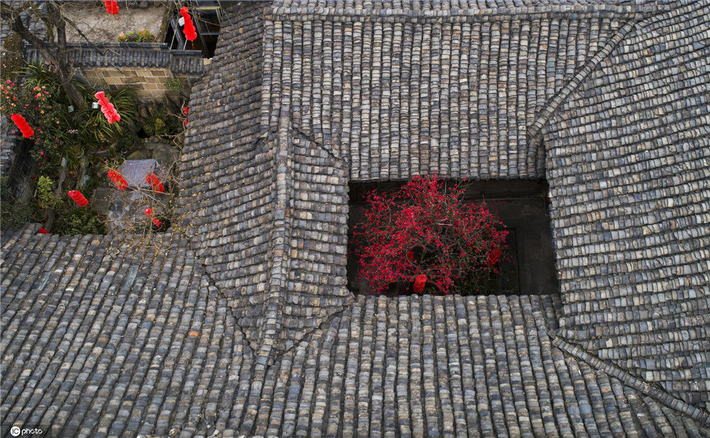 2020年2月21日,四川南充閬中古城中天樓旁,張家小院天井中的海棠在陽光中綻放(無人機拍攝)。