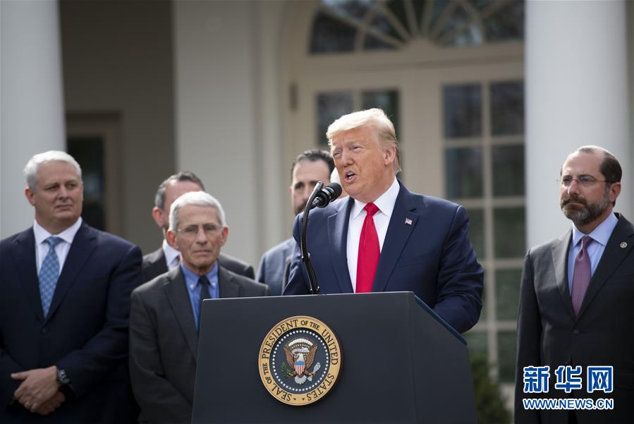 3月13日,美國總統(tǒng)特朗普(中)在華盛頓白宮的記者會(huì)上講話。特朗普當(dāng)天下午在白宮發(fā)表講話時(shí)正式宣布“國家緊急狀態(tài)”。他說,此舉旨在讓美國聯(lián)邦政府全力投入到抗擊新冠肺炎疫情的努力中。這項(xiàng)舉措將釋放500億美元資金,幫助各州和地方政府應(yīng)對疫情。新華社記者劉杰攝