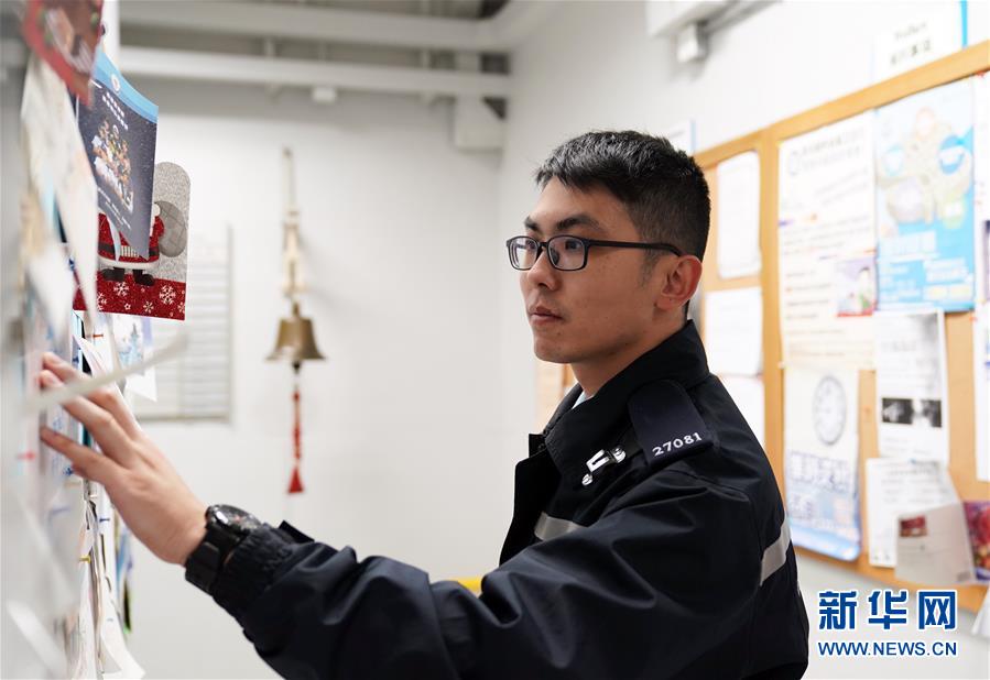 香港西區(qū)警署第三梯隊(duì)成員李Sir瀏覽市民寄來的心意卡(1月27日攝)。新華社記者李鋼攝