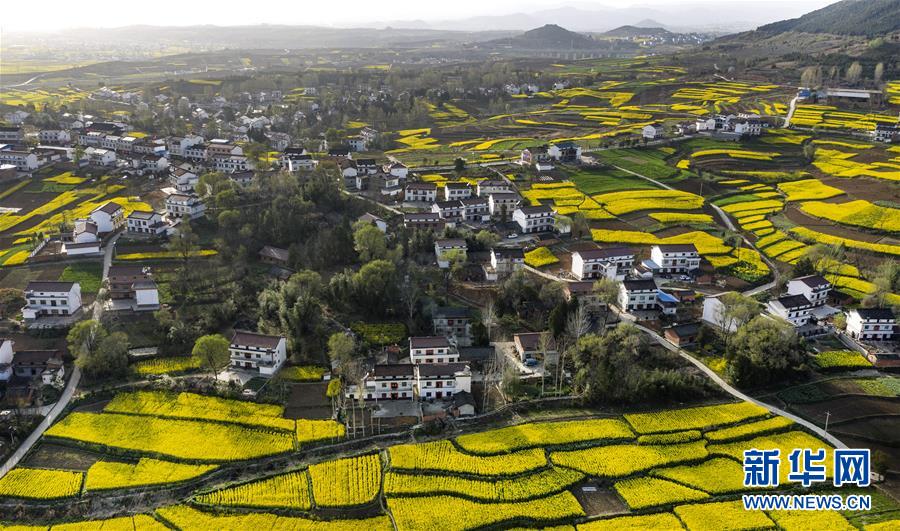 3月14日,洋縣龍亭鎮(zhèn)柳山村盛開的油菜花與村舍構(gòu)成美麗的圖畫(無人機(jī)照片)。 新華社記者陶明攝