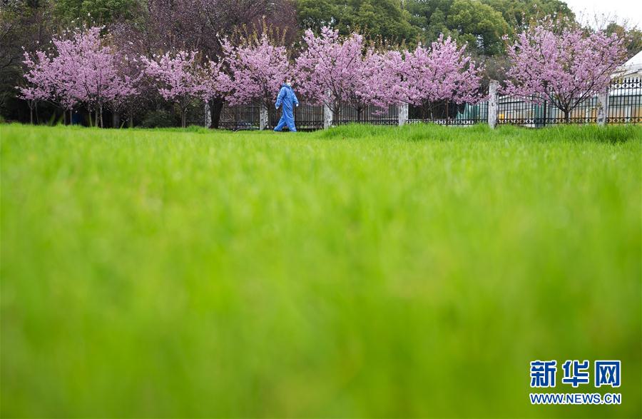 3月3日,一名工作人員從盛開的櫻花樹下走過。新華社記者費(fèi)茂華攝