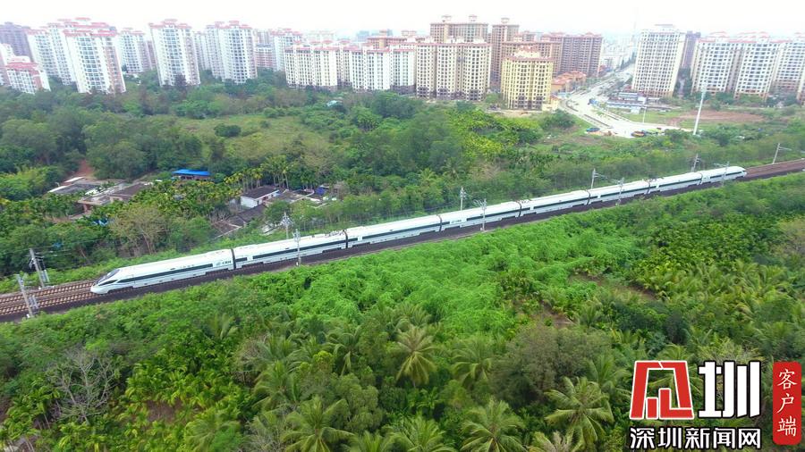 2020年3月17日,海南環(huán)島鐵路一列動車從春光明媚的瓊海城區(qū)經過。