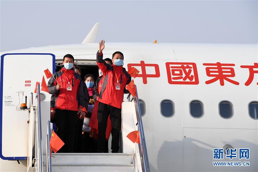 3月17日,醫(yī)療隊(duì)隊(duì)員抵達(dá)山東濟(jì)南遙墻國(guó)際機(jī)場(chǎng)。新華社發(fā)(饒琦攝)