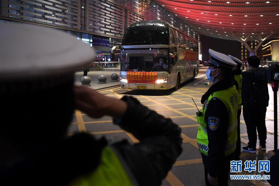 3月17日,抵達(dá)湖南長(zhǎng)沙南站的醫(yī)療隊(duì)隊(duì)員乘坐大巴離開。新華社記者薛宇舸攝