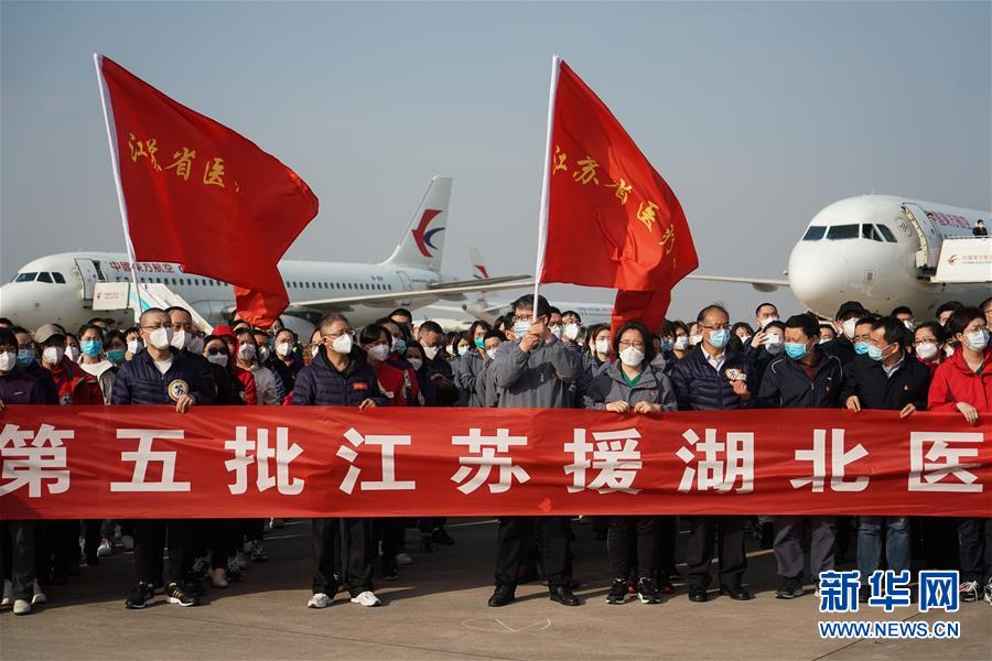 3月17日,醫(yī)療隊(duì)隊(duì)員抵達(dá)江蘇南京祿口國(guó)際機(jī)場(chǎng)。新華社記者季春鵬攝