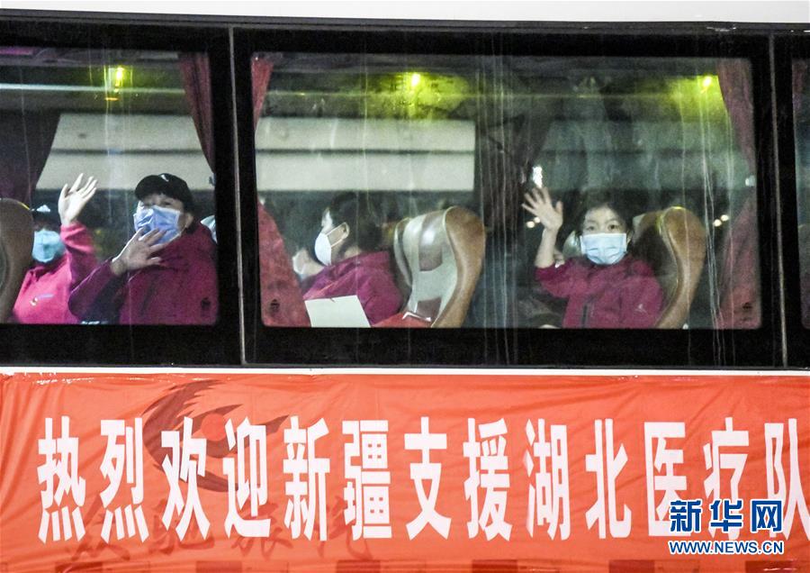 3月17日,在新疆烏魯木齊地窩堡國際機(jī)場(chǎng),醫(yī)療隊(duì)隊(duì)員坐上大巴車準(zhǔn)備離開。新華社記者王菲攝