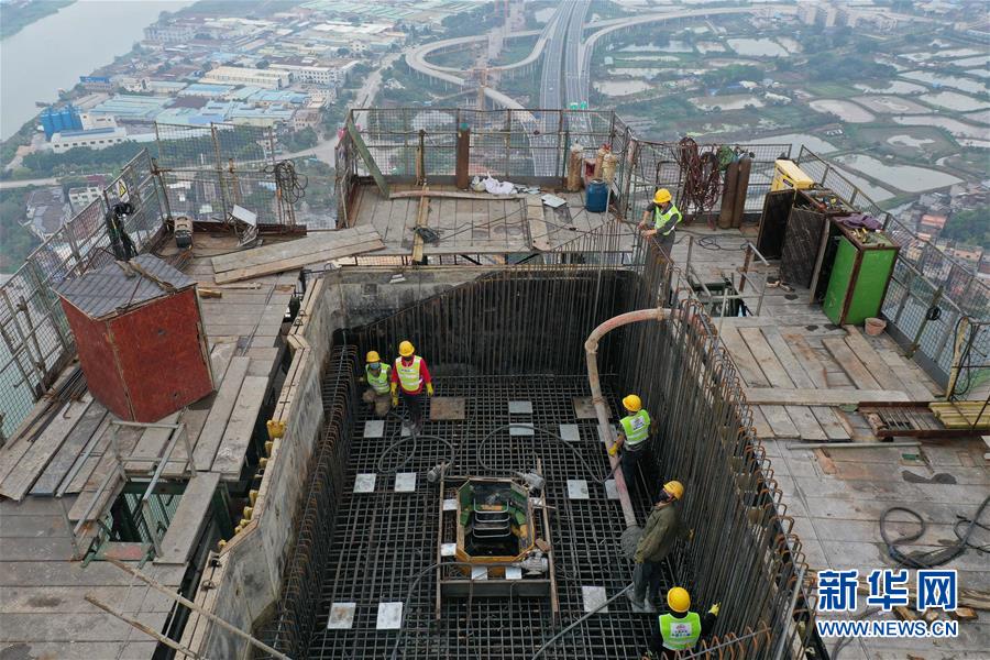 3月18日,施工人員在廣州南沙港鐵路跨西江斜拉橋東主塔進行封頂施工(無人機照片)。新華社記者劉大偉攝