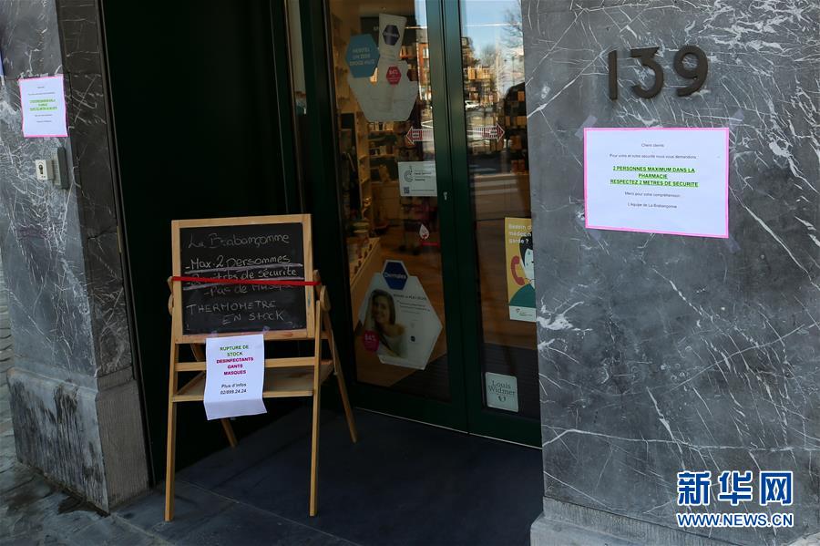 3月18日,在比利時(shí)布魯塞爾,一家藥店張貼的說(shuō)明提示最多容納2名顧客同時(shí)進(jìn)入。 新華社記者 張鋮 攝