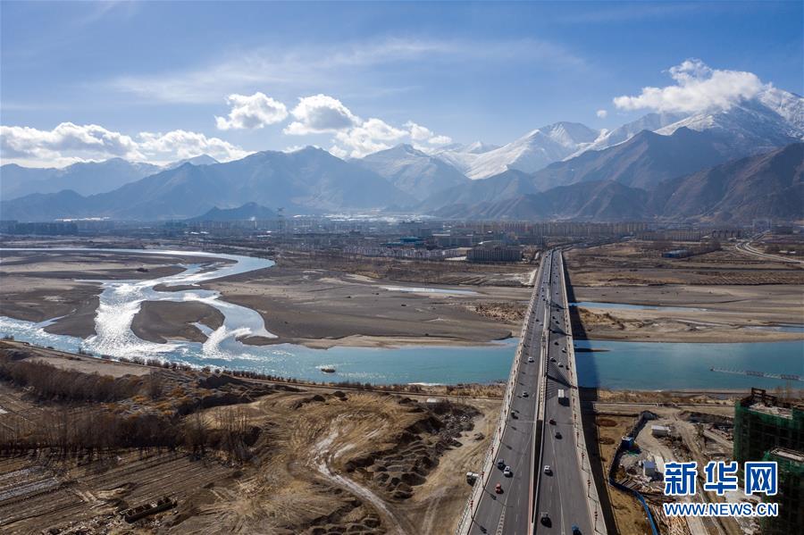 鳥(niǎo)瞰拉薩納金大橋(4月3日無(wú)人機(jī)拍攝)。新華社記者晉美多吉攝