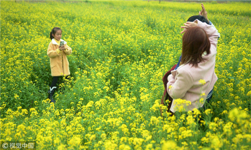 2019年2月5日,廣西來賓,當天是農歷大年初一,人們在忻城縣城關鎮(zhèn)隆光村油菜花海中賞花游玩。
