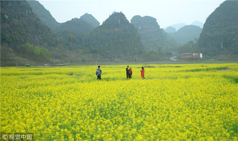 2019年2月5日,春節(jié)期間,廣西來賓市忻城縣萬余畝油菜花競相綻放,吸引眾多游客前來賞花游玩,感受春天的氣息。近年來,廣西忻城縣大力實施鄉(xiāng)村振興戰(zhàn)略,注重發(fā)展鄉(xiāng)村旅游產(chǎn)業(yè),把鄉(xiāng)村旅游與美麗鄉(xiāng)村、脫貧攻堅緊密結(jié)合起來,輻射帶動當(dāng)?shù)刎毨裘撠氈赂?。樊紹光/視覺中國